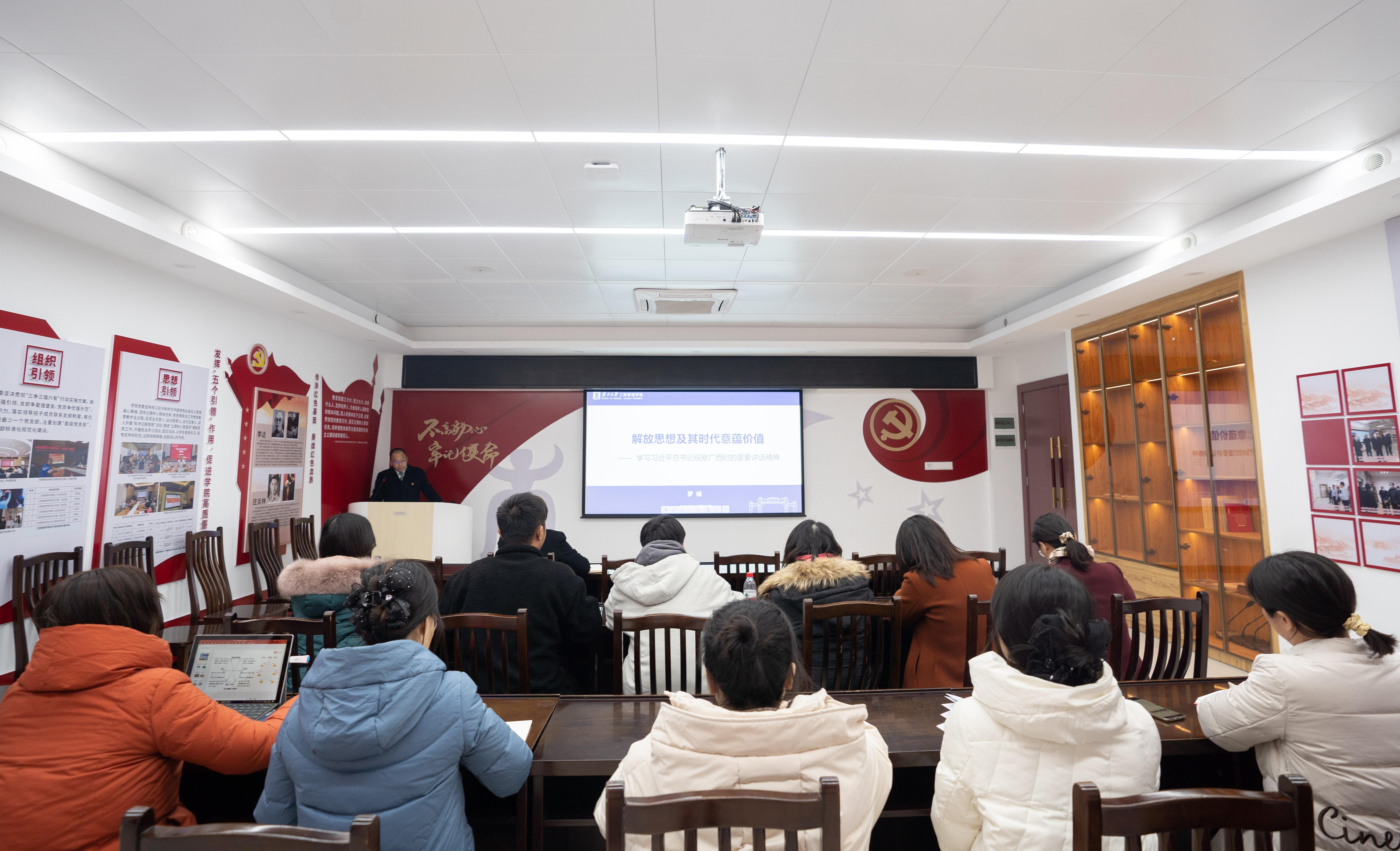 12月19日下午,教工行政党支部在公司党员活动室集中学习习近平总书记视察广西的重要讲话精神。公司党委书记罗诚以《解放思想及其时代意蕴价值》为题,带领教工行政党支部全体党员学习习近平总书记视察广西的重要讲话精神。