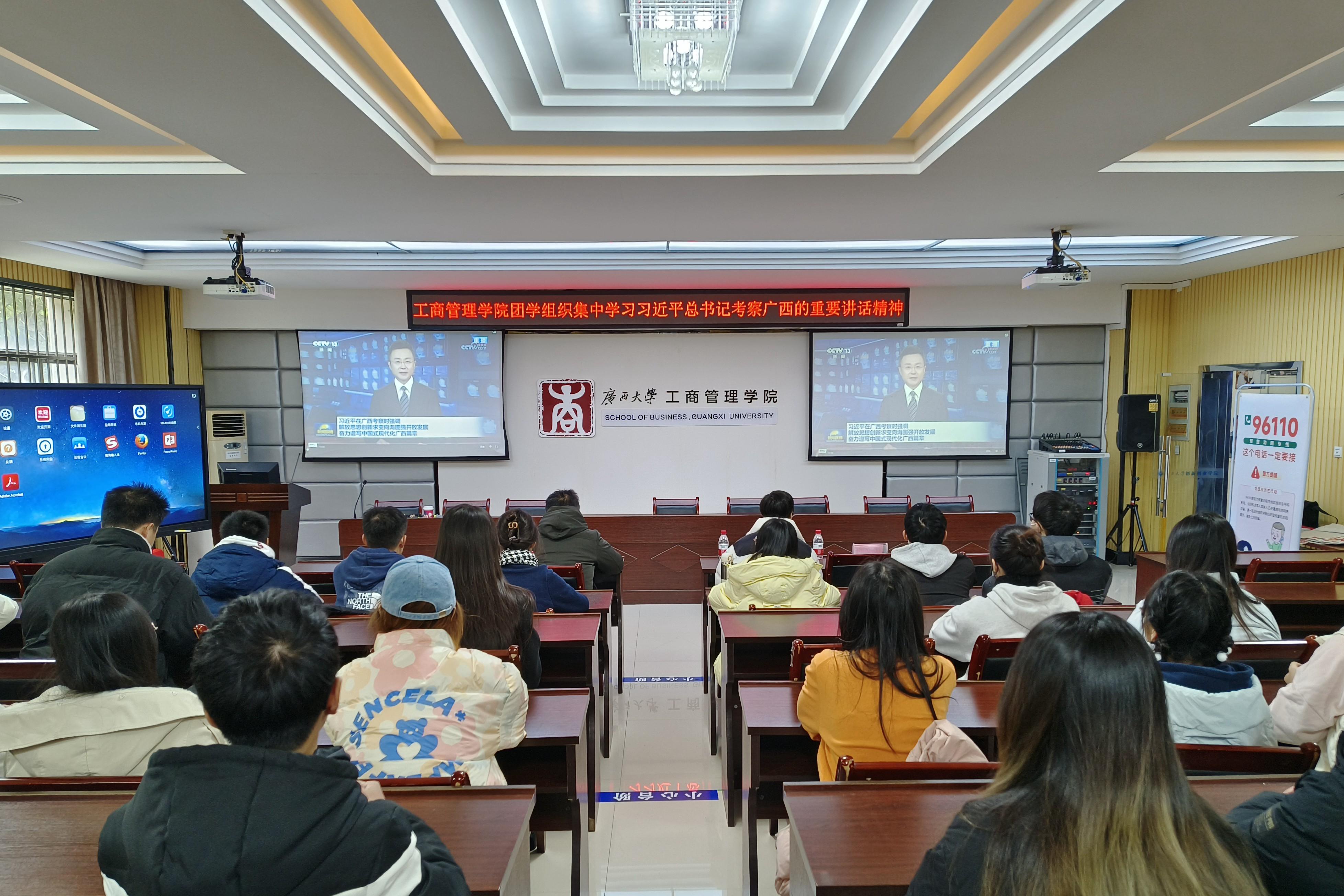 公司团学组织员工干部在公司124报告厅一起观看了习近平总书记视察广西的新闻报道视频,集中学习习近平总书记视察广西的重要讲话精神。