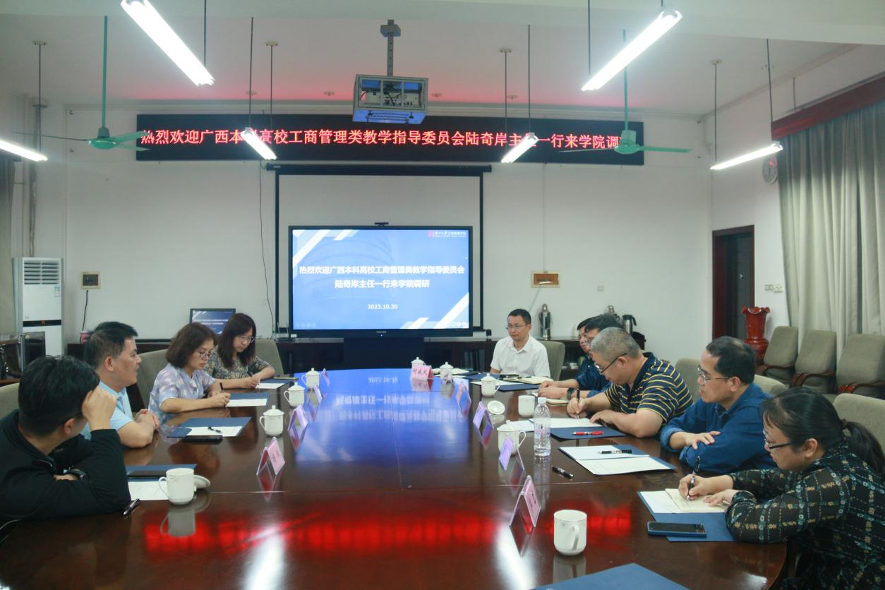 10月30日下午,广西本科高校工商管理类教学指导委员会主任陆奇岸,秘书长阳芳,委员张翔云、杨诚一行来公司调研。公司经理朱帮助主持座谈会,经理助理蒋侃及相关系主任、负责人参加座谈会。