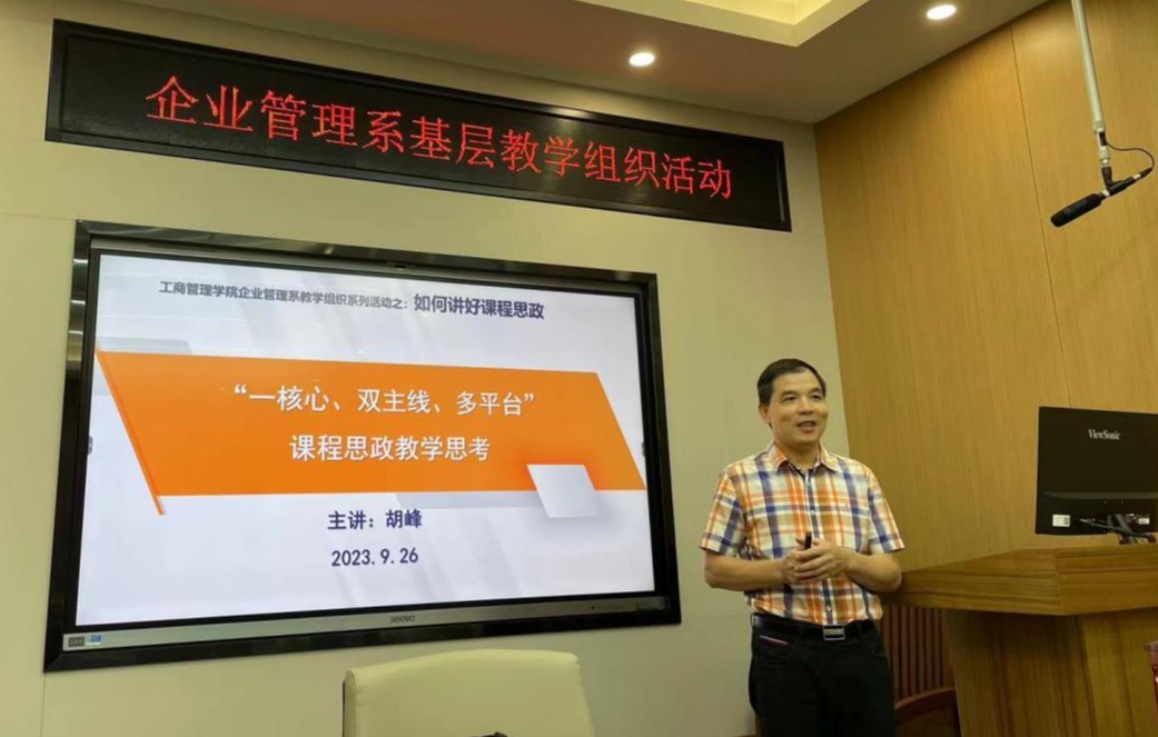 9月26日下午,企业管理系在公司232教室举行主题为“如何讲好思政课”的基层教学组织活动。活动上,胡峰老师和梁世昌老师分别以《“一核心、双主线、多平台”课程思政设计》和《科研思维推动课程思政教学》为题,结合自己所授课程和科研经历,以《人力资源管理》《创业学》《微观经济学》为例,给大家进行现场示范教学,演示如何将思政元素有机融入专业课程的教学中。