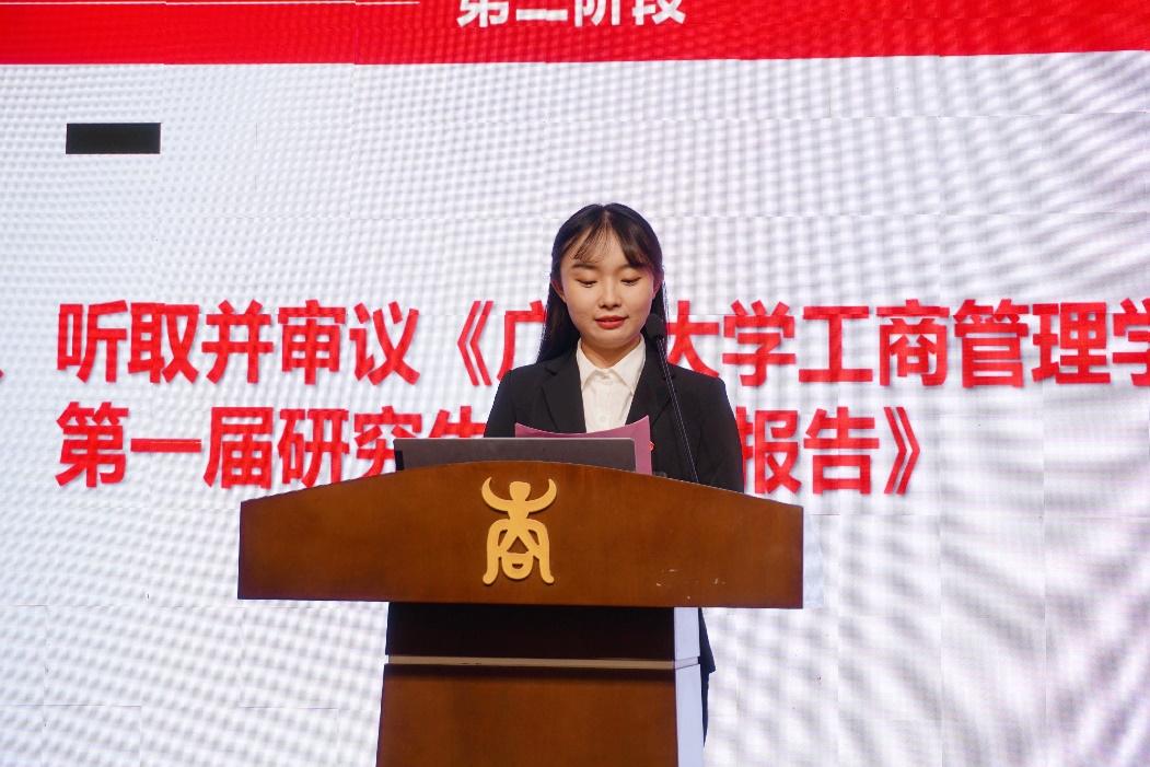 公司第一届研究生会执行主席向思源作《必一运动第一届研究生会工作报告》,总结过去一年研究生会在思想引领、学术创新、就业指导、文体娱乐、员工服务等方面开展的一系列成效显著的工作。她表示,将继续为建设有制度、有引领、有创新、有和谐的研究生会而奋斗,继承和发扬自信自强、迎难而上的西商精神,为建设师生满意的“四有”研究生会贡献青春力量。