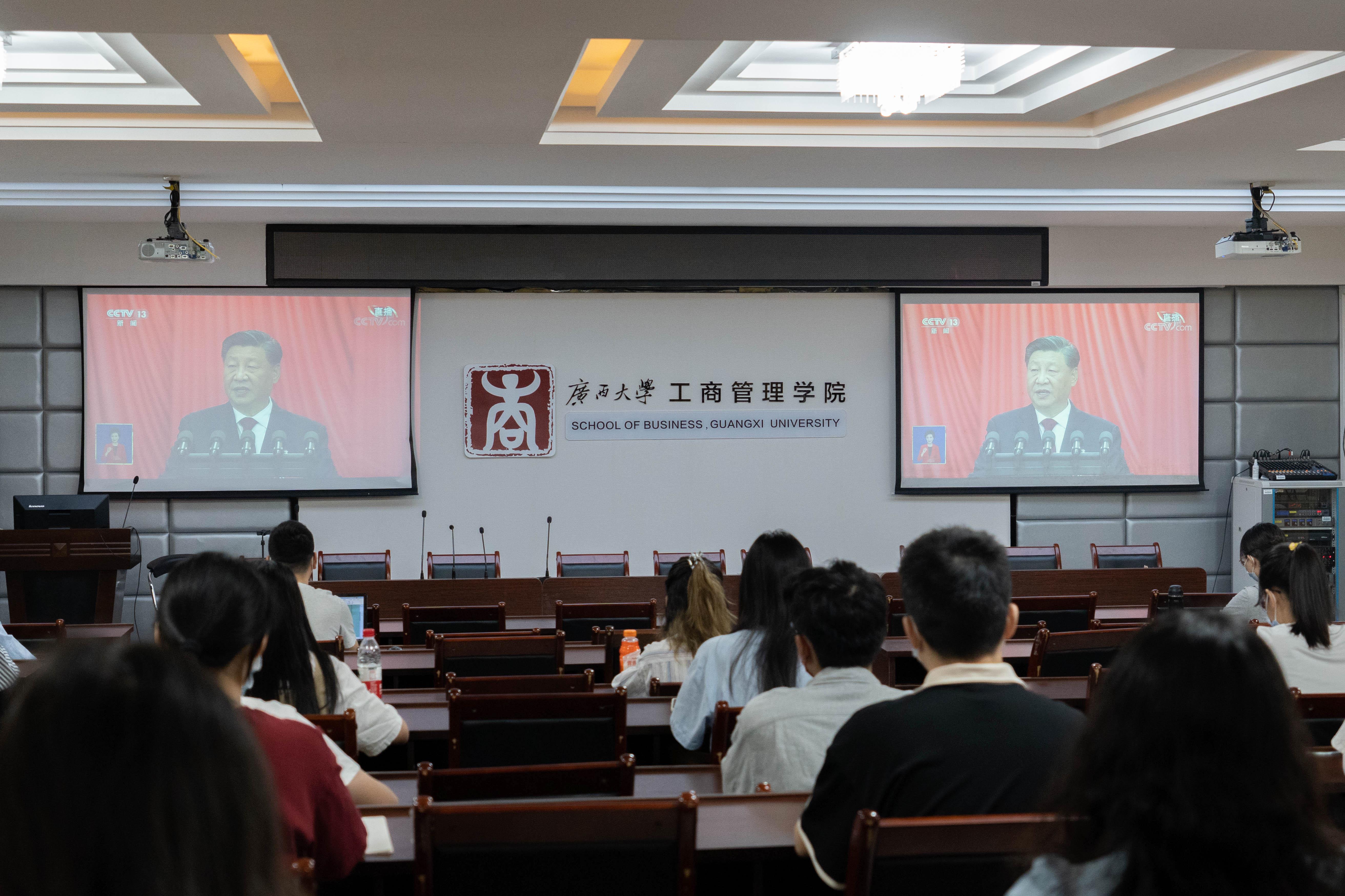 在必一运动128报告厅、124教室,公司党员干部、师生代表集中收看开幕会盛况,其余师生自发在办公室、在寝室、在家等场所,通过电视、网络、广播等渠道认真收看收听党的二十大开幕盛况。