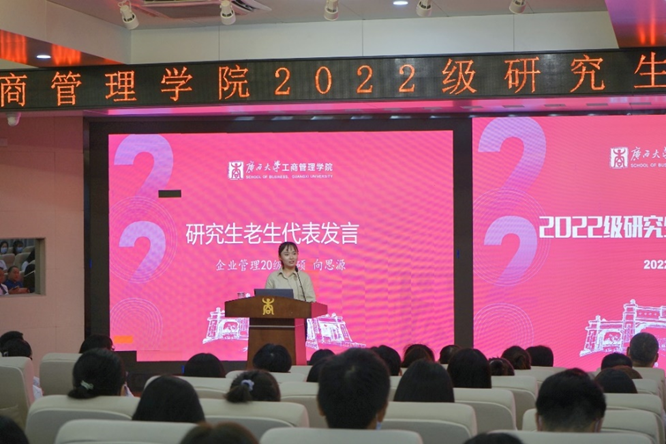 财务管理专业202班张伊蕾同学、企业管理20级学硕向思源同学作为老生代表发言。她们分享自己的大学经历与学习经验,希望给新生们带来启发。张伊蕾同学建议新生们:明确目标,勤学善思;积极向党组织靠拢,不断提升个人的政治素养;坚持锻炼,享受生活。希望同学们在大学这一条新的起跑线,把握好自己脚下的路。向思源同学以“你认为的学术是什么?”“你还有激情吗?”“你还在焦虑吗?”一连串环环相扣的询问,向新生们分享科研生活的经验,以自身的经历与感悟给同学们带来启迪,并祝愿同学们成为快乐、幸福、坚定、满足的人。