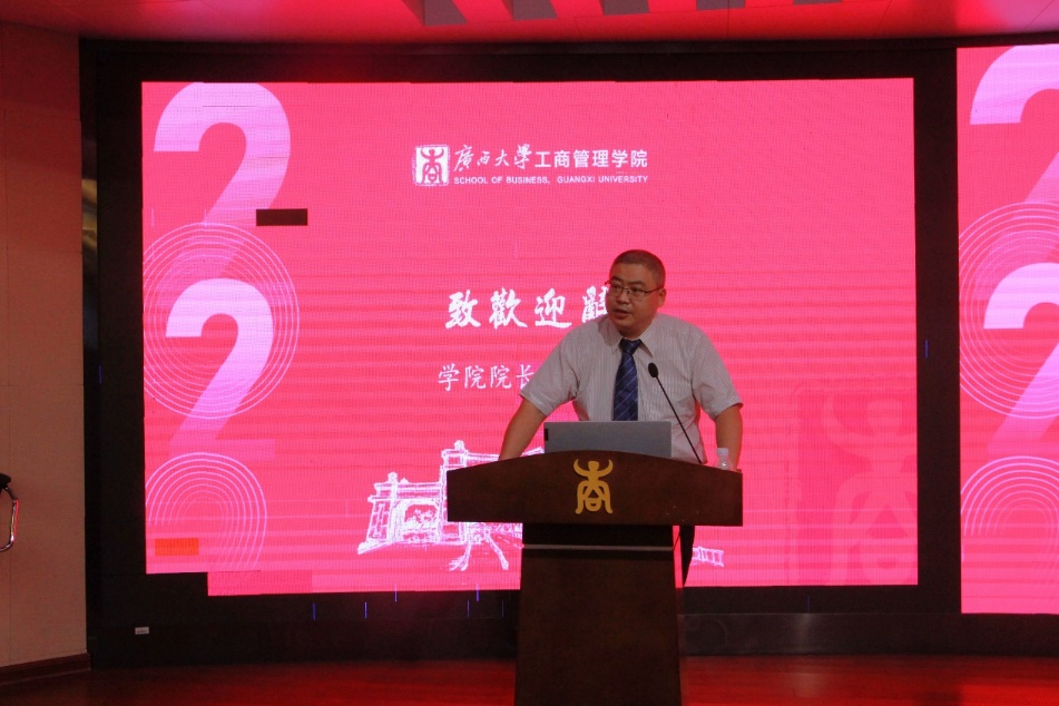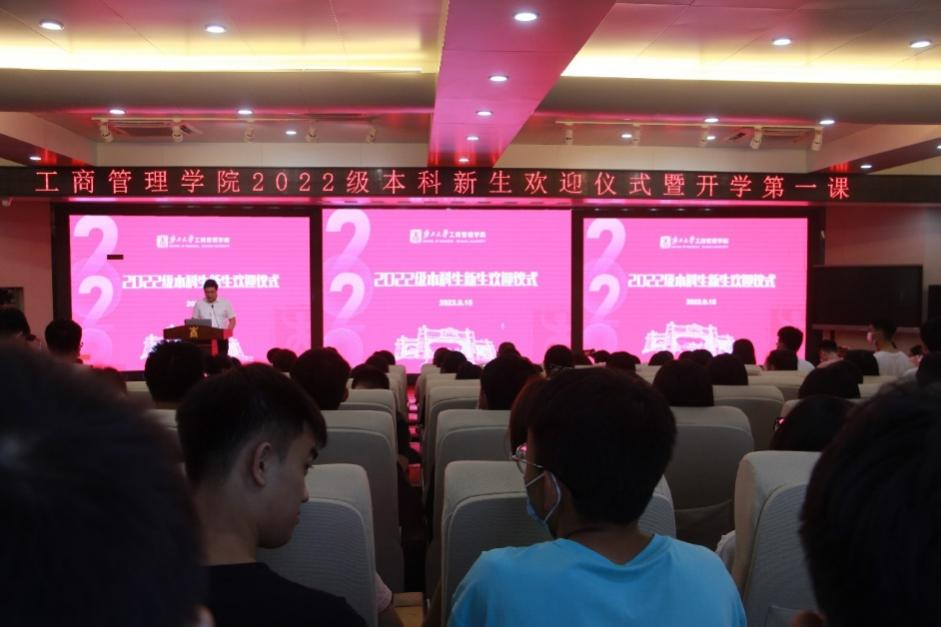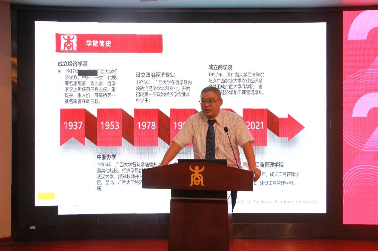 新生欢迎仪式结束后,朱帮助经理为2022级新生上开学第一课。他围绕“公司历史与发展”,结合公司特色、工商管理专业的发展趋势,向新生们指明了学习期间的发展道路。