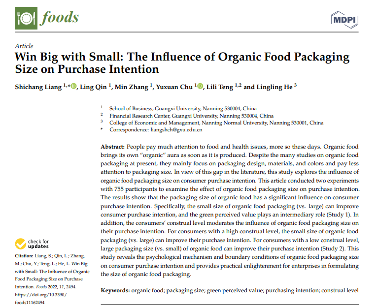近日,公司2019级工商管理专业本科生秦玲在国际知名期刊《Foods》上发表了题为“Win Big with Small: The Influence of Organic Food Packaging Size on Purchase Intention” 的学术论文。该期刊为JCR一区,其最新的影响因子为5.561。公司梁世昌老师为指导老师(第一作者),本科生秦玲为第二作者,合作作者有张敏(2020级硕士研究生)、初宇轩(2020级硕士研究生)、滕莉莉(必一运动教授)和何玲玲(南宁师范大学),必一运动体育公司为第一单位。