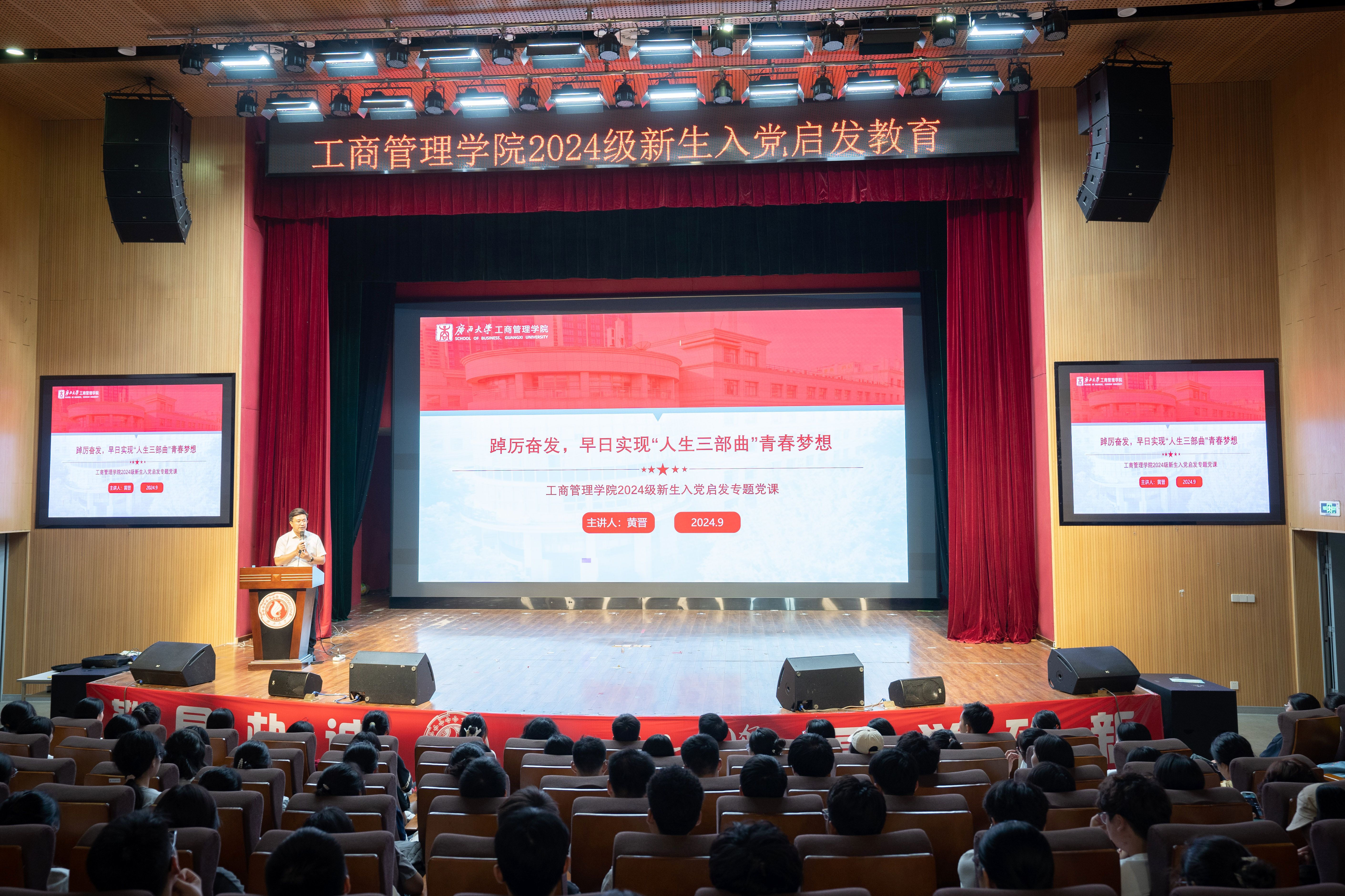 为加强公司2024级新生理想信念教育,进一步做好新生入学后的早启蒙、早教育、早培养工作,激发同学们对党的信仰和追求,引导青年员工听党话、跟党走,9月6日上午,公司党委在公司老员工活动中心小剧场开展2024级新生入党启发教育。专题党课由公司党委书记黄晋主讲,公司党委副书记肖克宁、组织员黄照温、学工组辅导员郁文丹、管雅娣与全体新生一同参与学习。