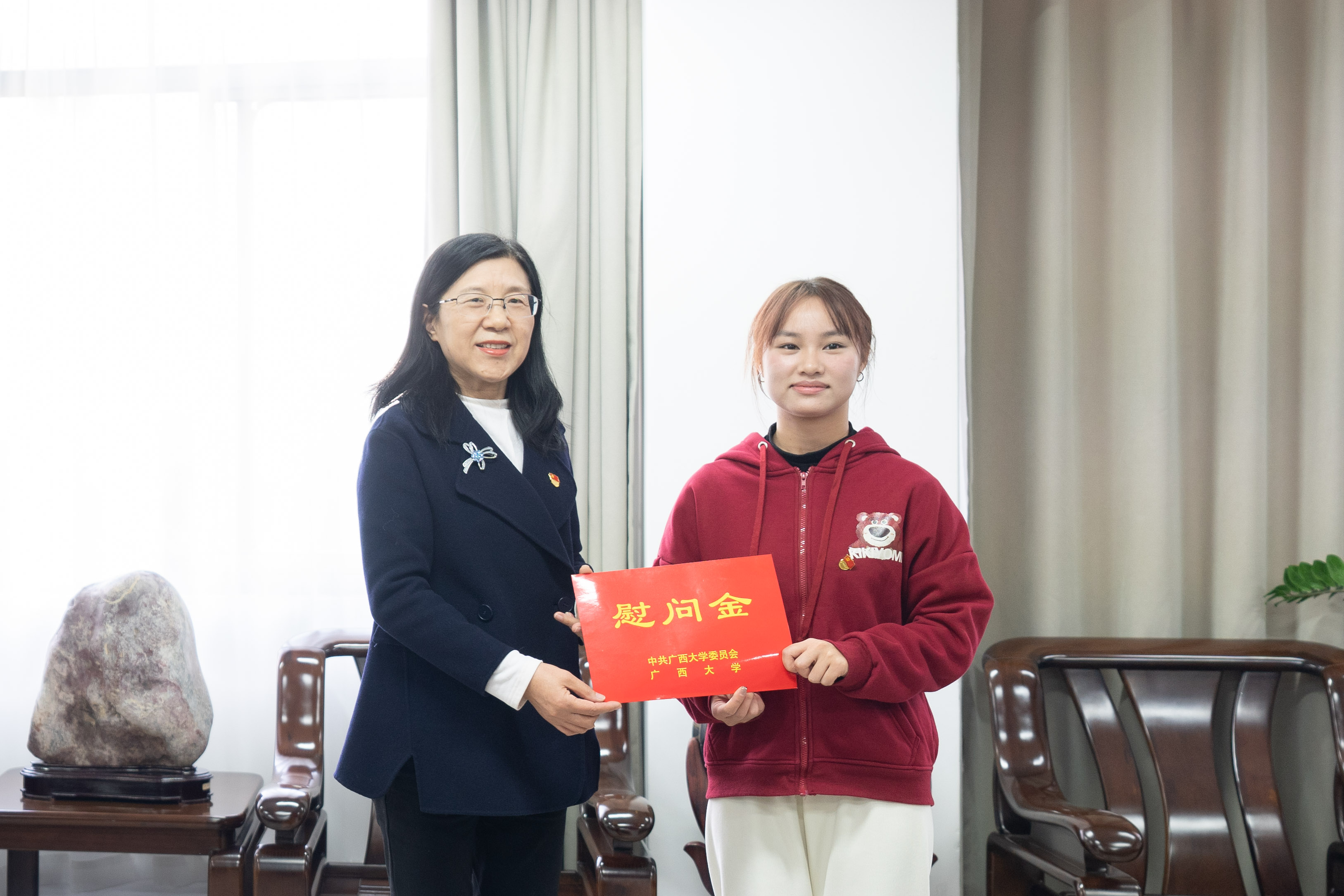 “平时学习忙不忙?”“生活上都有些什么困难?”金顺南亲切询问了韦尹洁的家庭情况和学习、生活方面的基本情况,对韦尹洁在面对困境时依然保持积极向上的乐观态度表示赞赏,称赞她阳光开朗的性格感染了身边的人,为周围同学树立了良好的榜样。她希望韦尹洁懂得感恩,珍惜来之不易的学习机会,将感恩之心化作前行的动力,用实际行动践行党员的初心和使命。她鼓励韦尹洁继续努力学习,积极参加公司和公司组织的各项活动,不断提升自己的综合素质,将来为国家和社会的发展做出贡献。
