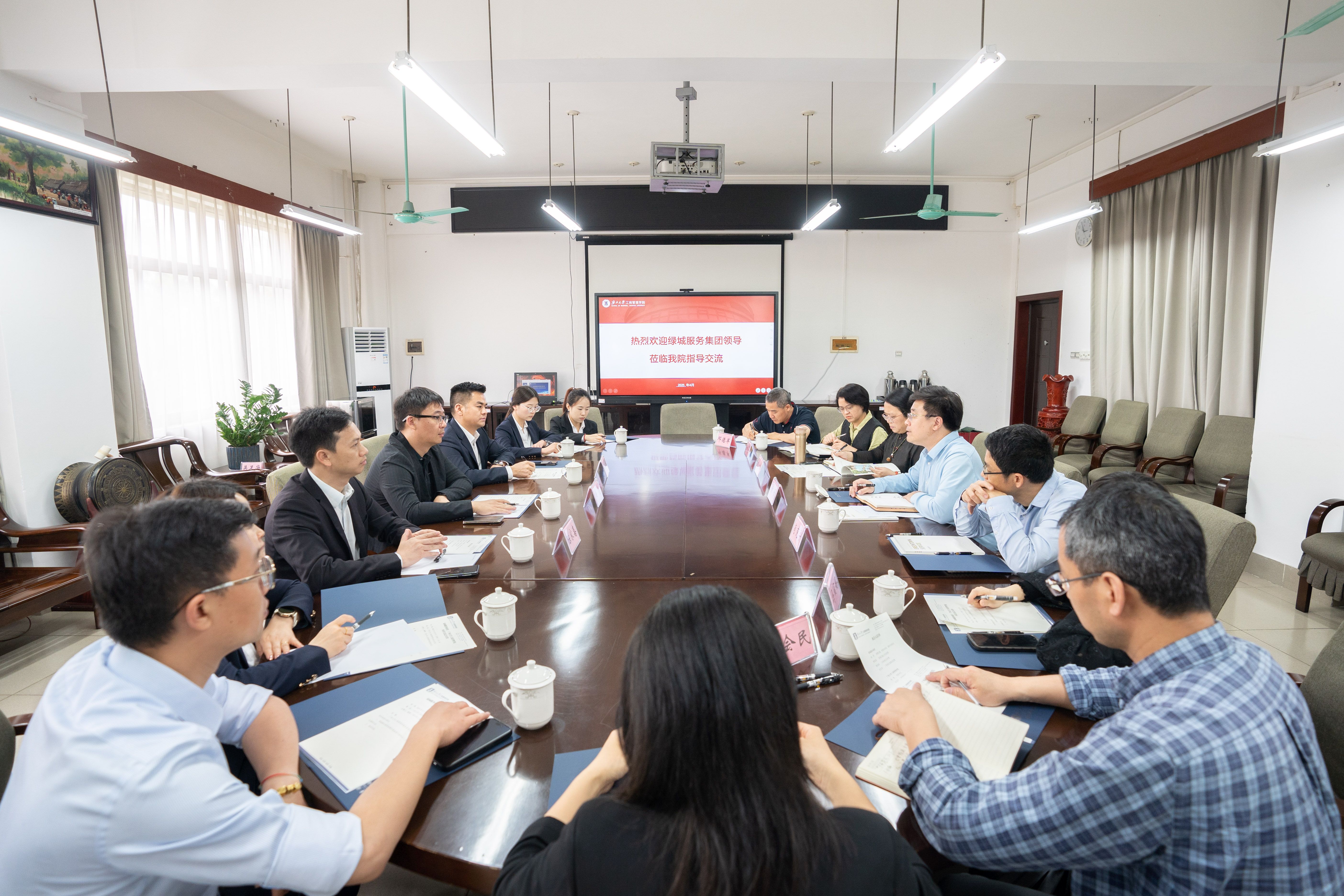 4月9日下午,绿城服务集团助理总裁、首席本体官、高校专班组长曲亮一行到公司调研交流。公司党委书记黄晋,党委副书记肖克宁、副经理朱少英与来宾在420会议室座谈。