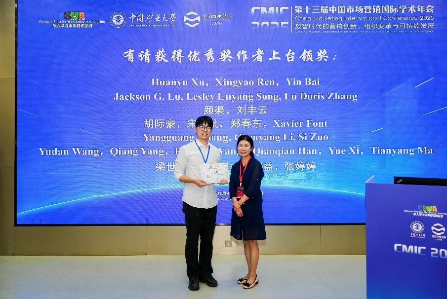 7月4日至7日,第十三届中国市场营销国际学术年会(CMIC2025)在中国矿业大学召开。由公司梁世昌副教授指导,2023级硕士研究生周易征、2022级硕士研究生李静益和张婷婷合作完成的论文《钱包紧了去哪儿玩?财务约束对旅游目的地偏好的影响》荣获“优秀奖”。