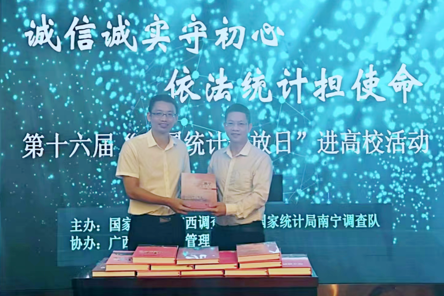 活动举行了赠书仪式,国家统计局南宁调查队党组成员、副队长梁家盟代表单位,向公司赠送2008-2024年《南宁调查年鉴》。这批涵盖17年南宁经济社会发展数据的年鉴,将为公司教学科研提供一手资料,成为资源共享、协同育人的重要载体,公司党委副书记肖克宁代表公司接受赠书。