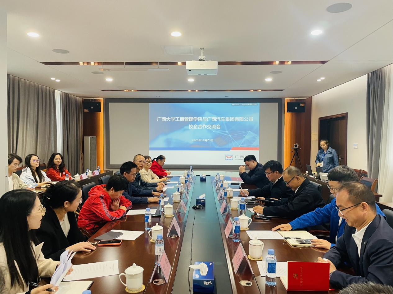 在广西汽车集团,调研组参观了总部展厅并举行校企合作座谈。座谈会由集团党委组织部部长李钦德主持,他介绍了企业人才培养战略及产业绿色发展政策,企业代表则详细解读了碳中和实施路径与碳排放管理实践。公司员工工作与政企服务办公室主任覃朝勇介绍了公司团队建设进展,希望推动双方在人才培养、双碳研究等领域深度合作。交流环节中,公司教师代表分别就国际市场战略、绿色财务、智能驾驶应用及创新体系建设提问。集团相关负责人、公司杰出员工结合学术与实践经验,系统解读了集团2016年以来的创新布局与成效,为师生理解制造业创新提供了生动范例。