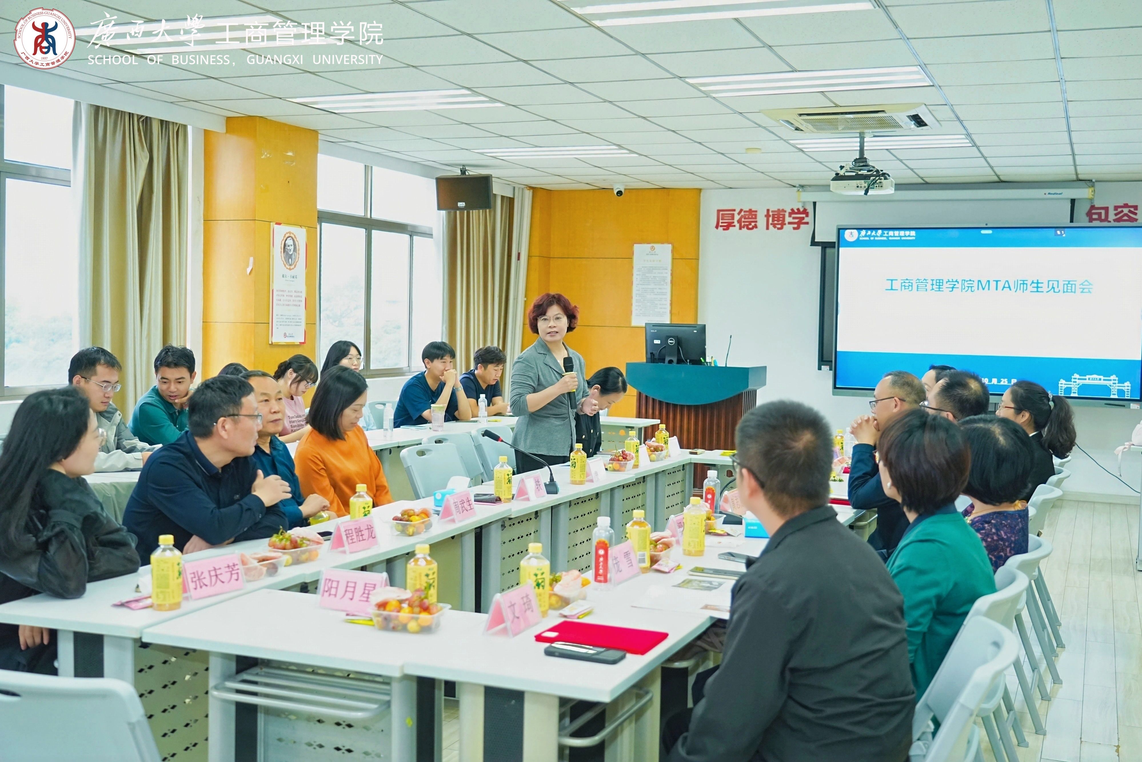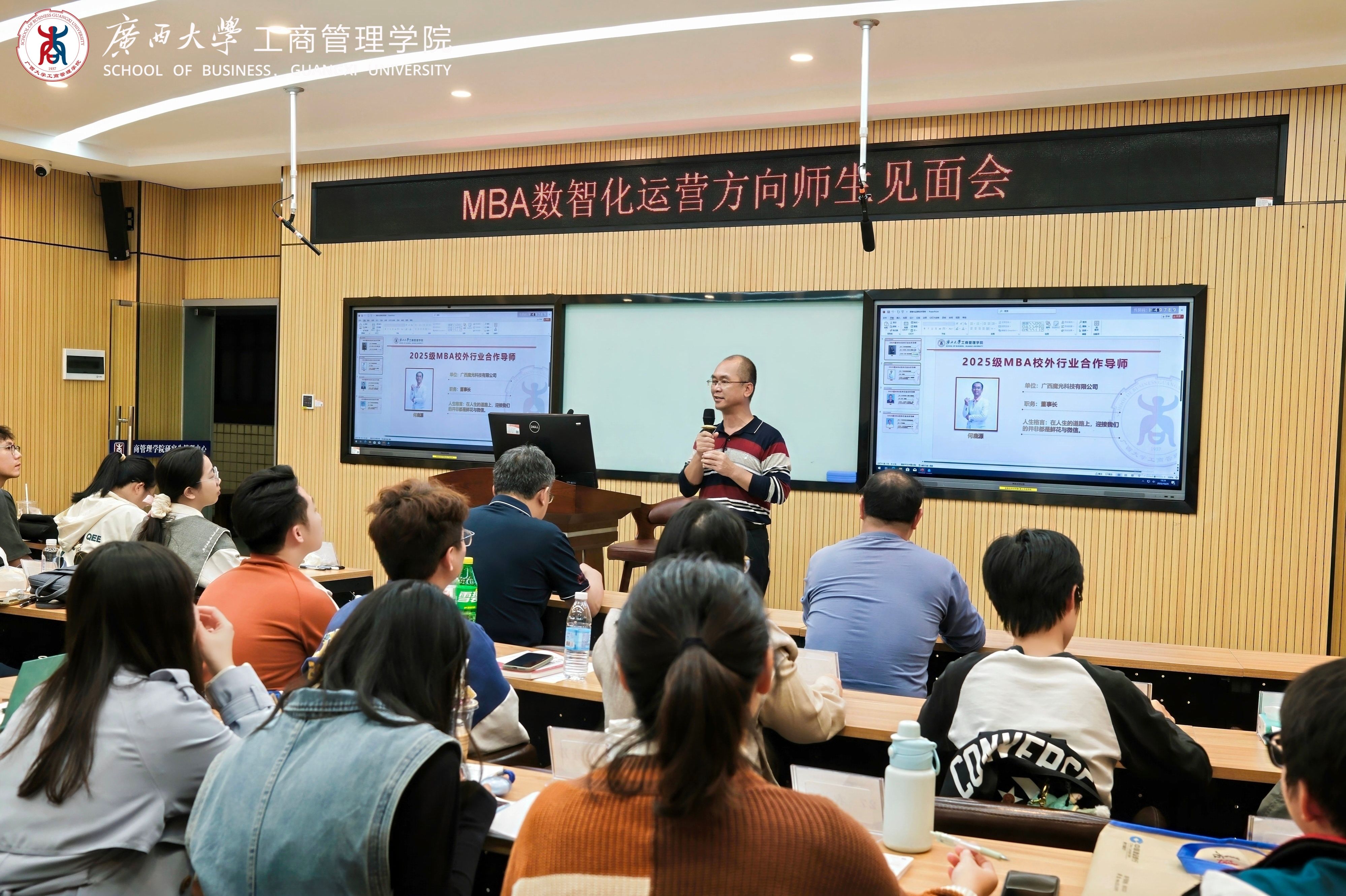 当晚,多场师生见面会分别在公司各教室同步举行,覆盖MBA各方向(科技产业运营、中国-东盟国际商务管理、数智化运营管理、科技金融、企业经营与管理五大模块)、EMBA、会计硕士和旅游管理硕士等项目。各位导师从专业学习、工作实践与行业发展等多个角度,与员工们亲切深入交流,加深了同学们对各行各业的认知,助力同学们将理论与实践相结合,为今后的学习研究奠定基础。
