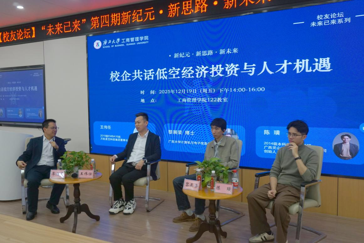 主题分享环节,嘉宾们带来前沿洞见与实践经验分享。2019级EMBA员工、万航星空科技集团董事长王伟任指出,低空经济需从“飞起来”向“连、用、管”演进。其公司构建“低空智联网”,业务拓展至农林、物流、应急等多场景,强调AI与低空融合是规模化关键,呼吁共建标准与数据共享机制,助力广西打造面向东盟的低空示范区。