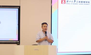 紧接着,岑汉成老师就23级新成员由本科生变成研究生身份的转变提出了自己的建议。岑老师表示,加入研会对于同学们适应身份转换是非常有帮助的,能让新成员更快的融入公司。随后,他指出,研究生做学术是一个偏向孤独的旅程,但如果同学们加入不同的组织并体验不同的组织文化,对于提升同学们适应公司,加强就业竞争力都是非常有帮助的。最后,岑老师对研会的工作表示了肯定,并表明服务他人的过程也是成就自己的过程。