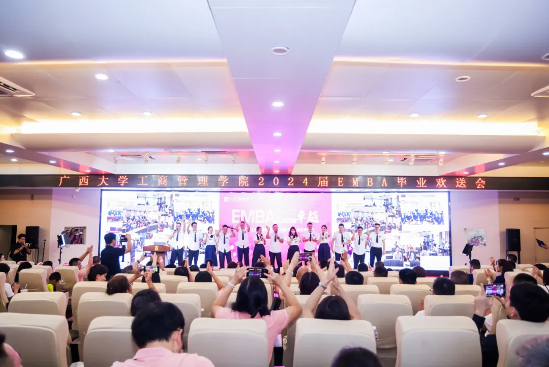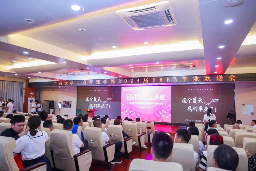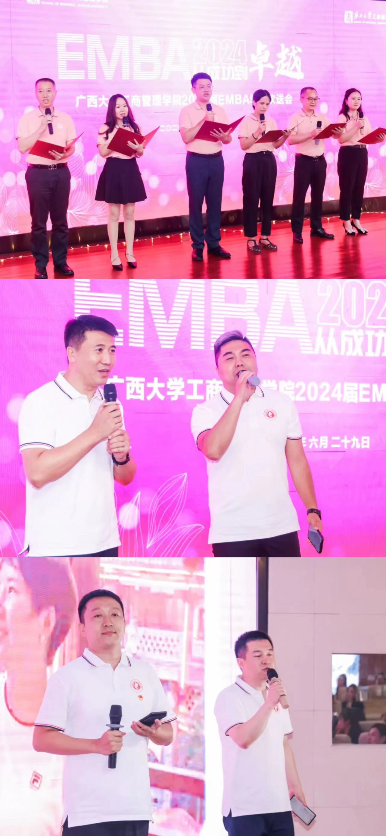 6月29日下午,2024届EMBA毕业生欢送会在128报告厅隆重举行。工商管理公司党委副书记肖克宁、副经理朱少英、申韬、刘民坤、廖东红,导师代表唐玉生、覃朝勇等老师出席了欢送会,共同为此次毕业的EMBA同学庆祝。此次欢送会由EMBA21班周艳、EMBA22班居香、EMBA23班陆宏亮主持。