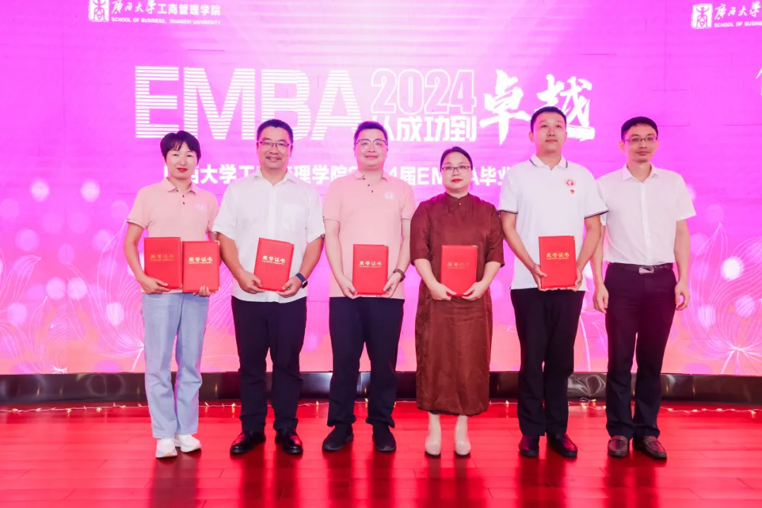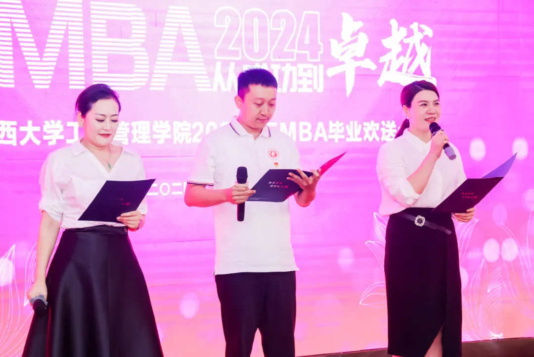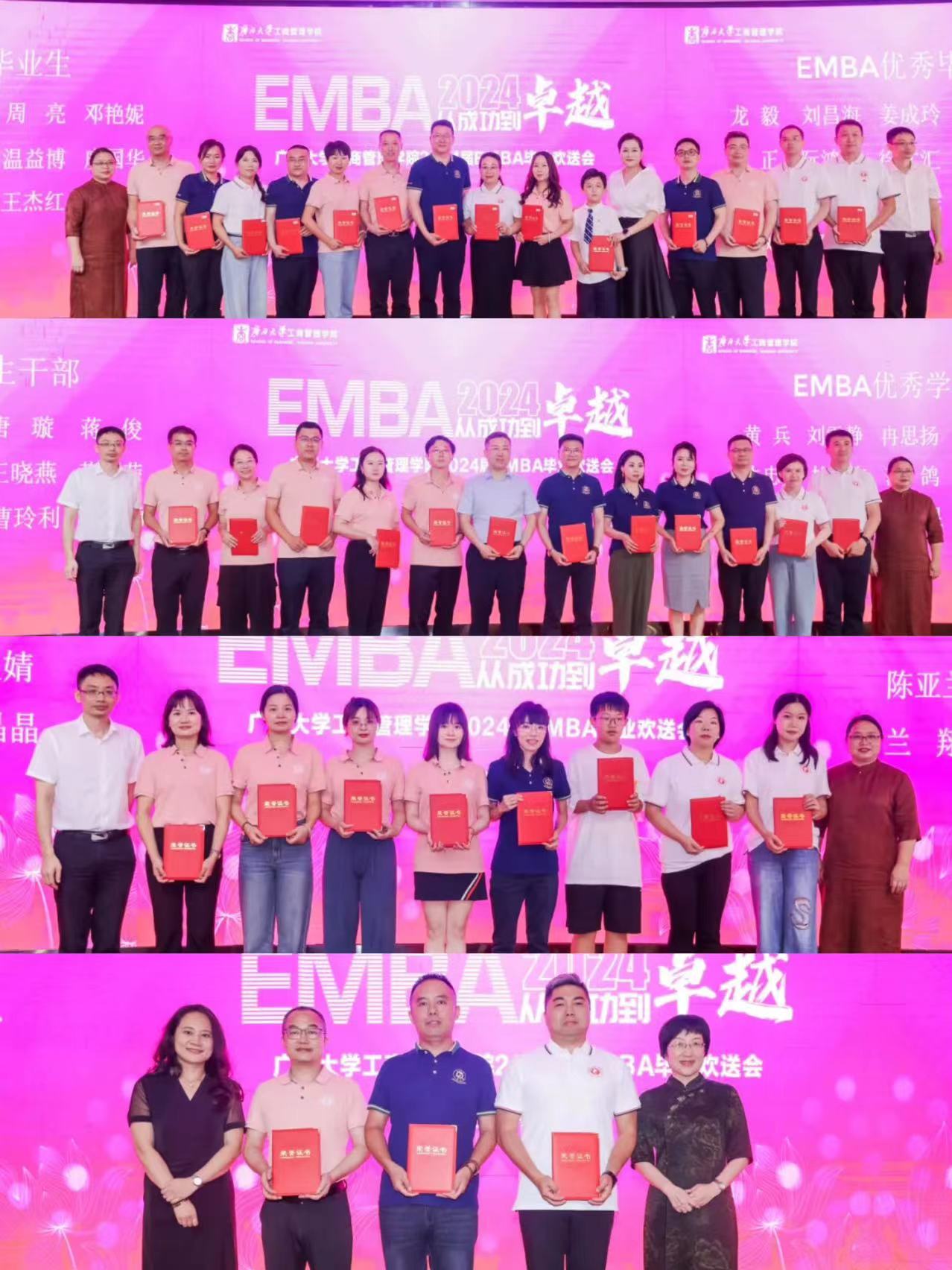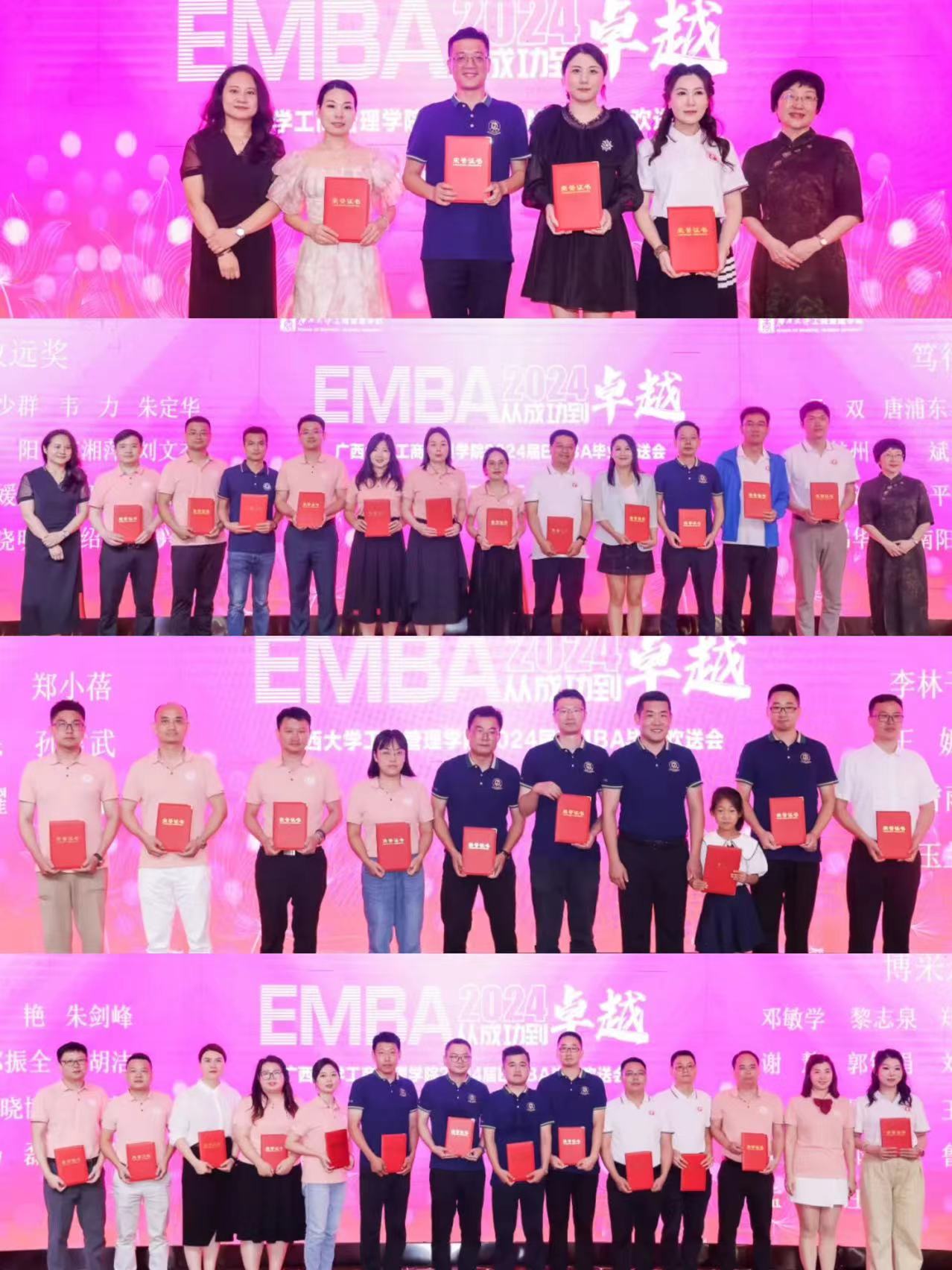 6月29日下午,2024届EMBA毕业生欢送会在128报告厅隆重举行。工商管理公司党委副书记肖克宁、副经理朱少英、申韬、刘民坤、廖东红,导师代表唐玉生、覃朝勇等老师出席了欢送会,共同为此次毕业的EMBA同学庆祝。此次欢送会由EMBA21班周艳、EMBA22班居香、EMBA23班陆宏亮主持。