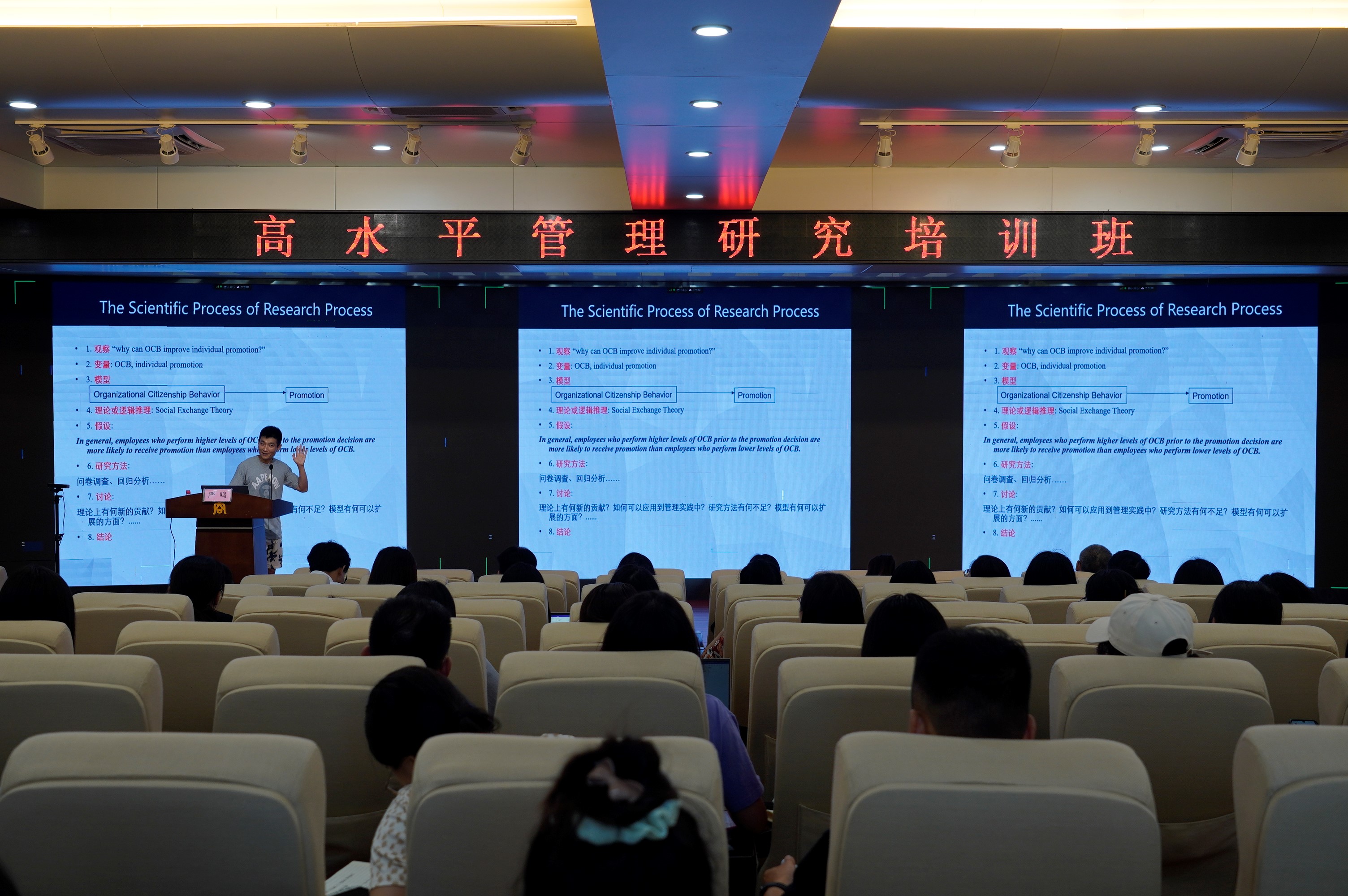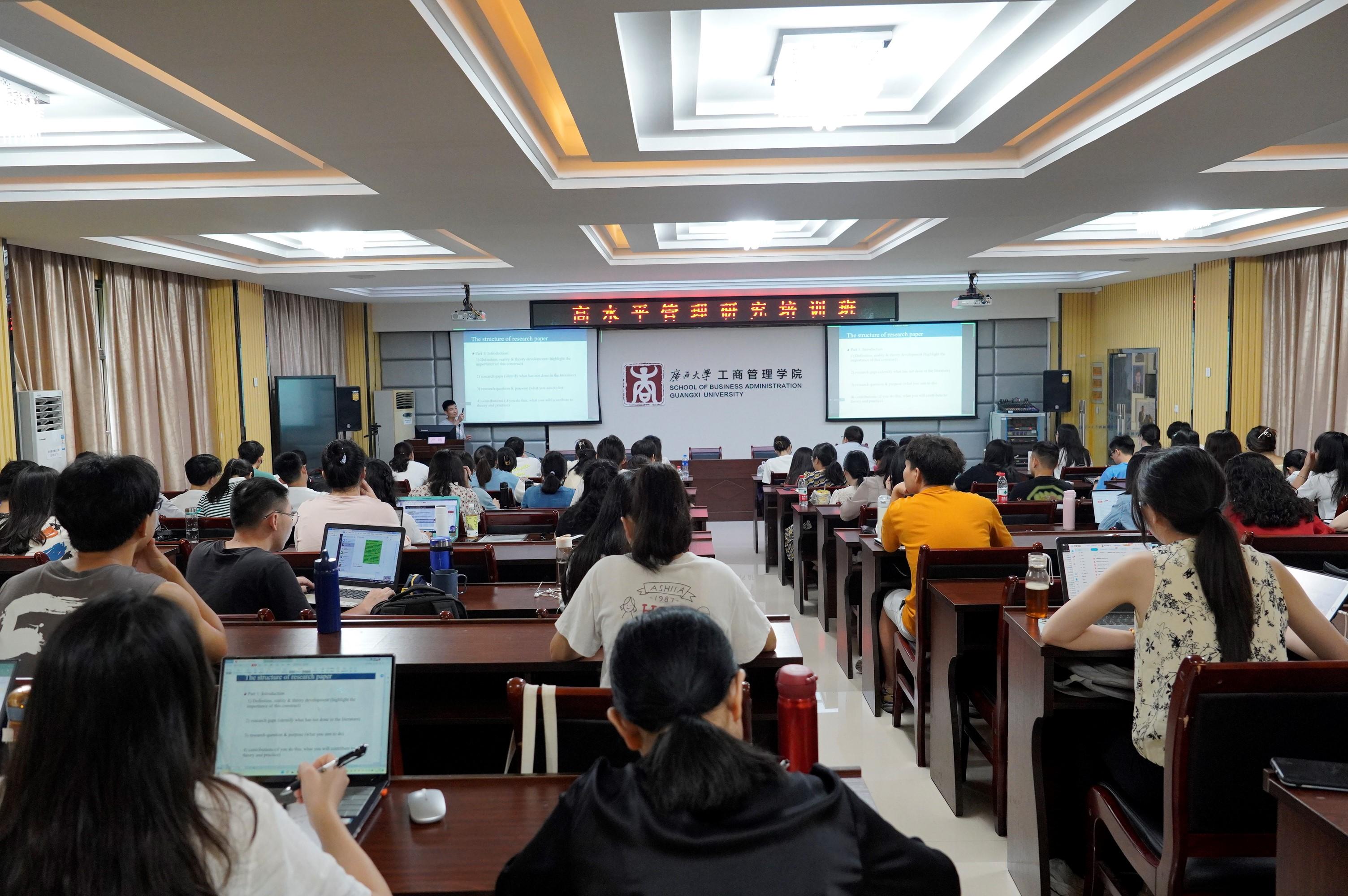 在培训课上,严鸣教授以“保持好奇心和关注有趣的现象”开篇,引出“研究是什么?”、“我们为什么要做研究?”以及“如何做好研究?“等问题。他对研究中科学的定义进行了界定,明确了研究视角与理论基础不一样的观点。严鸣教授强调了理论的重要性,进行科学研究要使用科学的标准,研究过程要运用理论和逻辑推理来证明事物间的因果关系,并给出了从观察中得到研究问题的建议。他用丰富的模型和路径图演示了交互、中介等效应的应用,界定了调节效应和交互效应的区别,进行了“理论贡献提升”的主题分享。他指出,写好理论贡献能增强所写“故事”可读性,还从多视角分享了提升研究贡献的技巧。严鸣教授以 “如何让别人有兴趣看你的文章”的问题引导师生们展开思考,并详细地介绍了一篇文章的完整写作结构,指出一篇好文章的基础是提出一个好的问题。此外,严鸣教授还对管理学实证研究的种类及其实际操作进行了讲解。