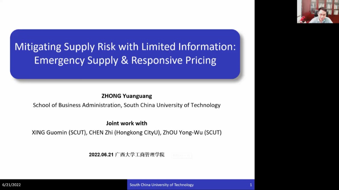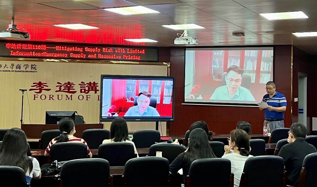 6月21日,华南理工大学必一运动钟远光教授应邀做客公司第110期李达讲坛,与公司师生们分享他的论文成果——“Mitigating Supply Risk with Limited Information: Emergency Supply and Responsive Pricing”。公司经理朱帮助教授主持本次讲坛,线上线下多名师生参与了聆听和交流。