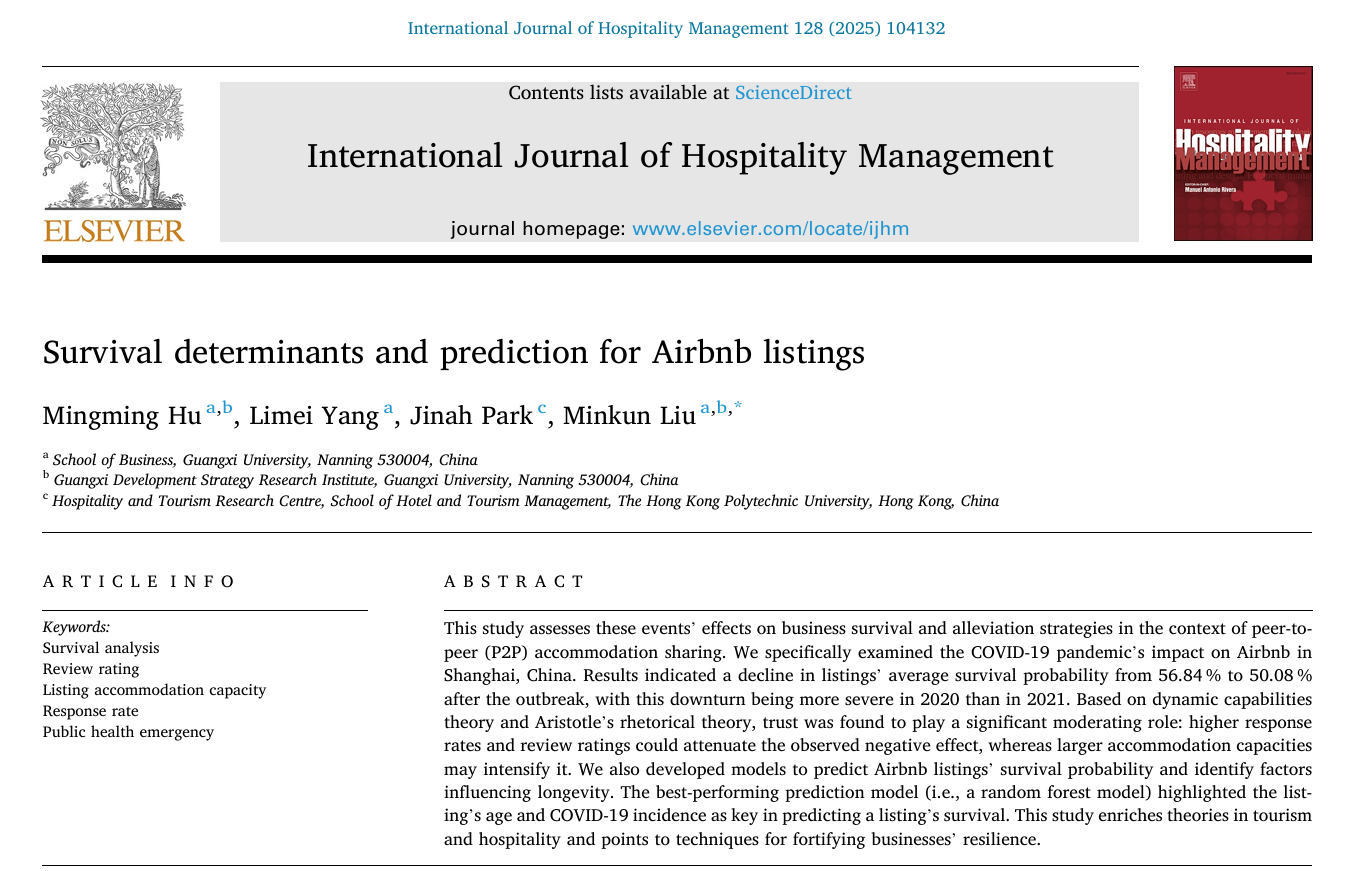 近日,公司胡明明团队在共享民宿生存分析和预测领域研究取得新进展,研究成果以“Survival determinants and prediction for Airbnb listings”为题,在旅游管理国际高水平期刊《International Journal of Hospitality Management》上发表。论文的第一作者为公司胡明明副教授,通讯作者为公司刘民坤教授,公司博士研究生杨丽梅在两位老师的指导下参与研究并共同发表论文,必一运动体育公司为第一单位和通讯单位。