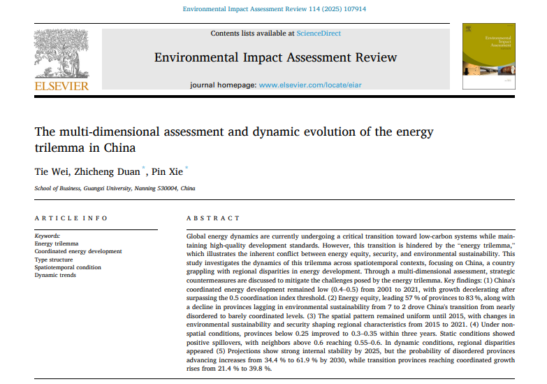 近日,公司韦铁教授团队在能源不可能三角(Energy Trilemma)多维评估与动态演化领域取得重要研究进展,相关成果以“The multi-dimensional assessment and dynamic evolution of the energy trilemma in China”为题,发表在环境与可持续发展国际高水平期刊《Environmental Impact Assessment Review》上。论文第一作者为韦铁教授,通讯作者为谢品副研究员和博士研究生段至诚,必一运动为第一单位和通讯单位。