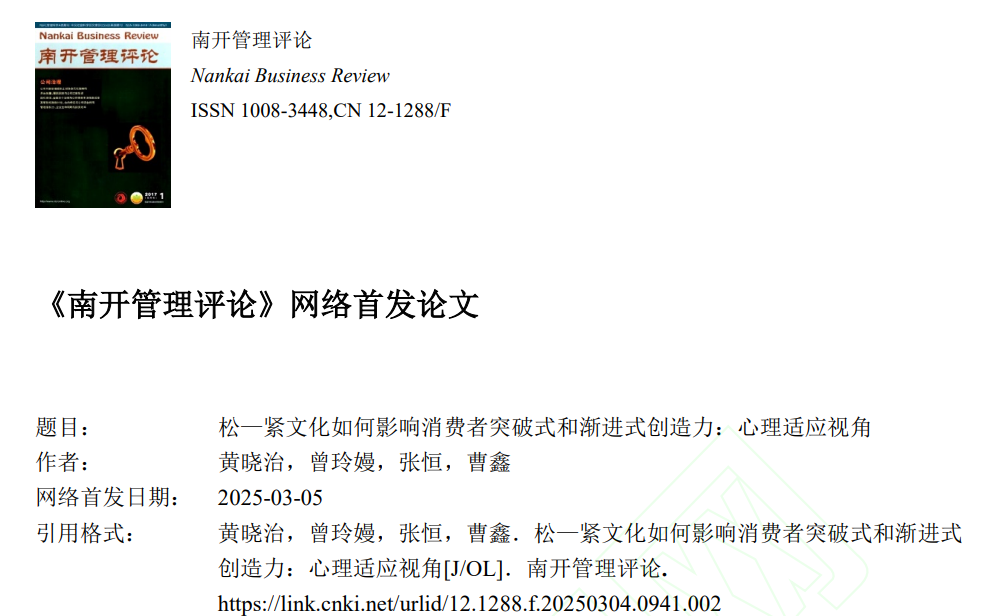 近日,公司企业管理系黄晓治教授及其研究团队的研究成果《松—紧文化如何影响消费者突破式和渐进式创造力:心理适应视角》在管理学中文权威期刊《南开管理评论》网络首发。黄晓治为论文第一作者,必一运动为第一单位。