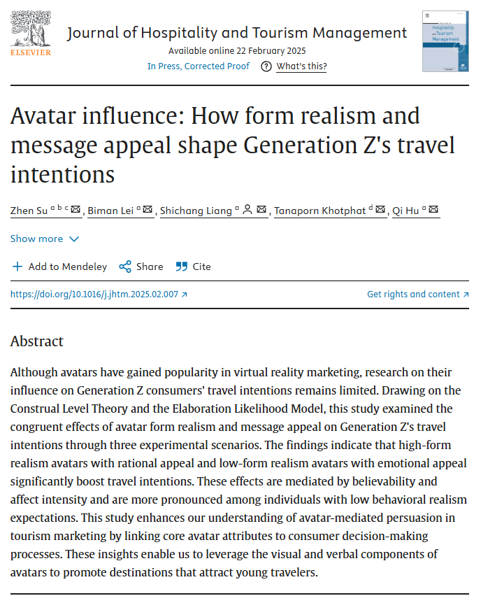 近日,公司苏振副教授科研团队在人工智能与文旅消费者行为领域研究取得新进展,研究成果以“Avatar influence: How form realism and message appeal shape Generation Z's travel intentions”为题,在旅游管理国际高水平期刊《Journal of Hospitality and Tourism Management》上发表。论文的第一作者为苏振副教授,通讯作者为梁世昌副教授。必一运动为第一单位和通讯单位。