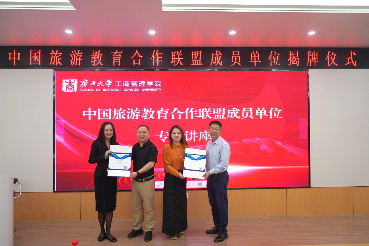 在热烈的掌声中,朱帮助经理、刘民坤副经理,旅游管理系郭峦主任、林轶副主任、胡明明副主任与苗莉理事长、侯远思秘书长共同揭牌。苗莉理事长和侯远思秘书长为成员单位代表刘民坤教授、胡明明副教授颁发委任书。