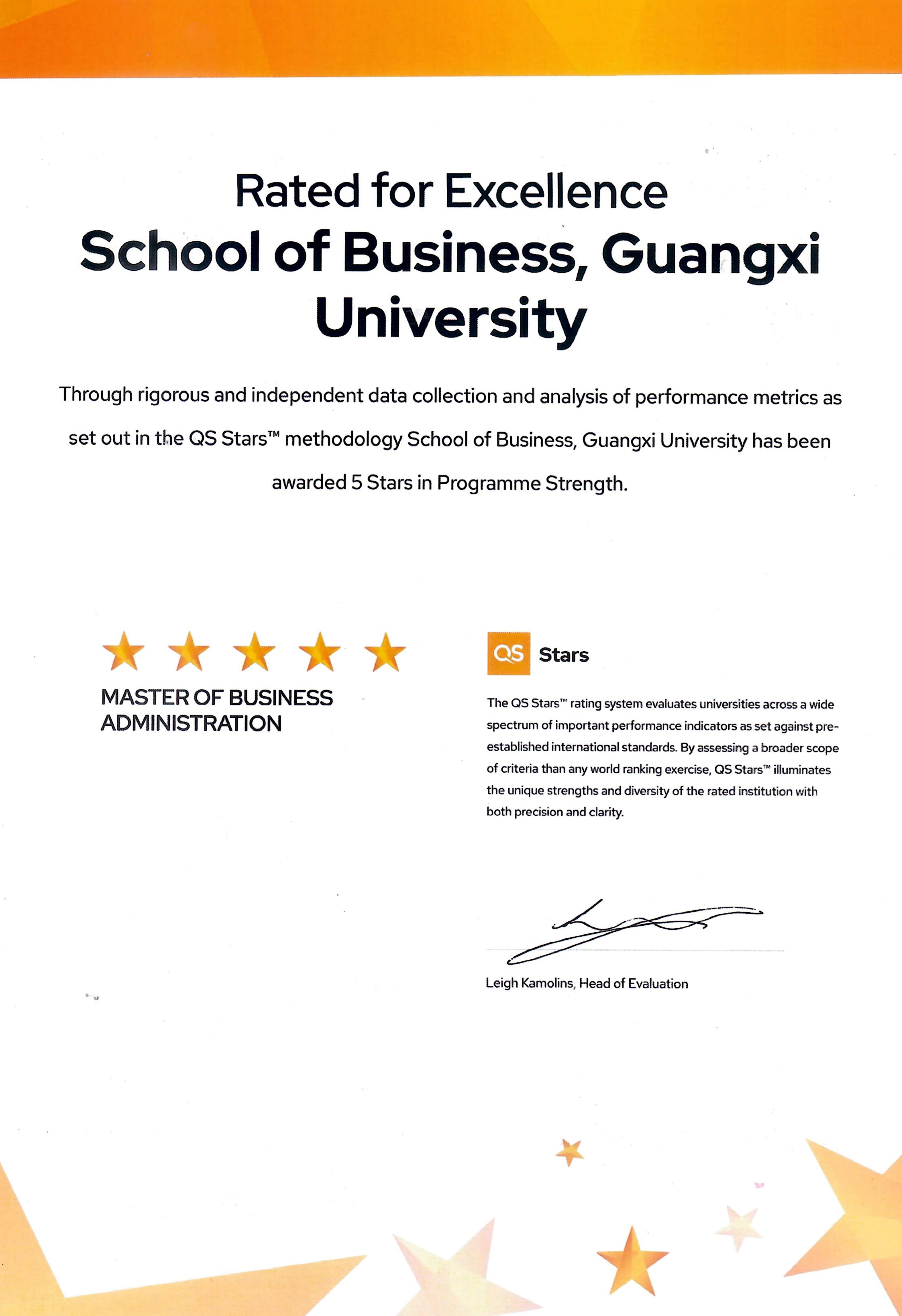 2024年11月5日,公司MBA项目成功获得QS Stars五星评级认证,是全国第二家荣获QS Stars MBA专业五星认证的公司,也是广西首家获得五星认证的公司。