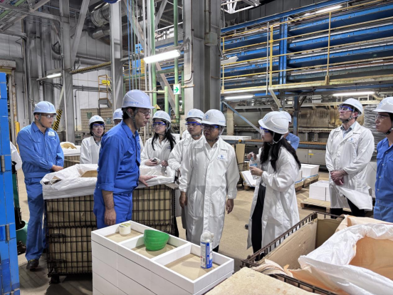 在环球新材国际生产线现场,苏尔田与团队讨论新产品技术路线